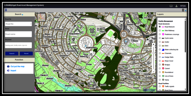 Kigali Road Asset Management System (K-RAMS): This pilot system, implemented along a 100km road network, provides a web-based platform for efficient road management, maintenance and planning.